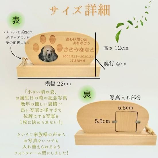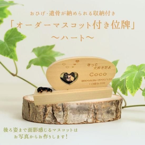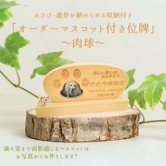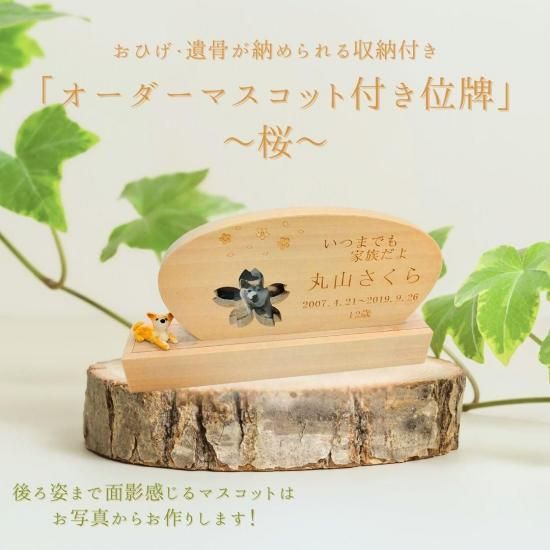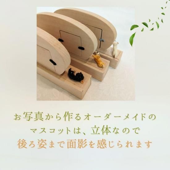 ペットちゃんのお写真から、オーダーメイドでマスコットをお作りして位牌にセットいたします。遺影のお写真では正面のお顔がメインになりますが、マスコットから背中の模様やおしっぽの形など、大切な子のおもかげを全身感じ取っていただけます。
