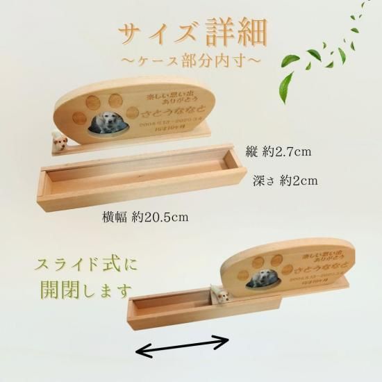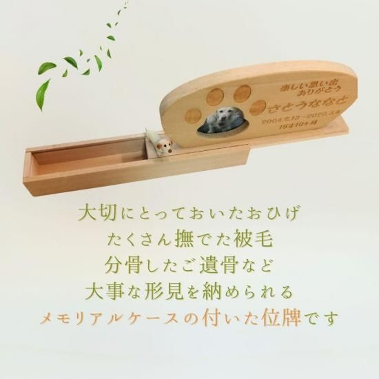 大切にとっておいた遺毛や、分骨したお骨の一部、床に落ちていたのを大事に拾っておいた形見のおひげなど、大切な遺品を納めておけるよう、土台がスライド蓋式のメモリアルポケットになっています!